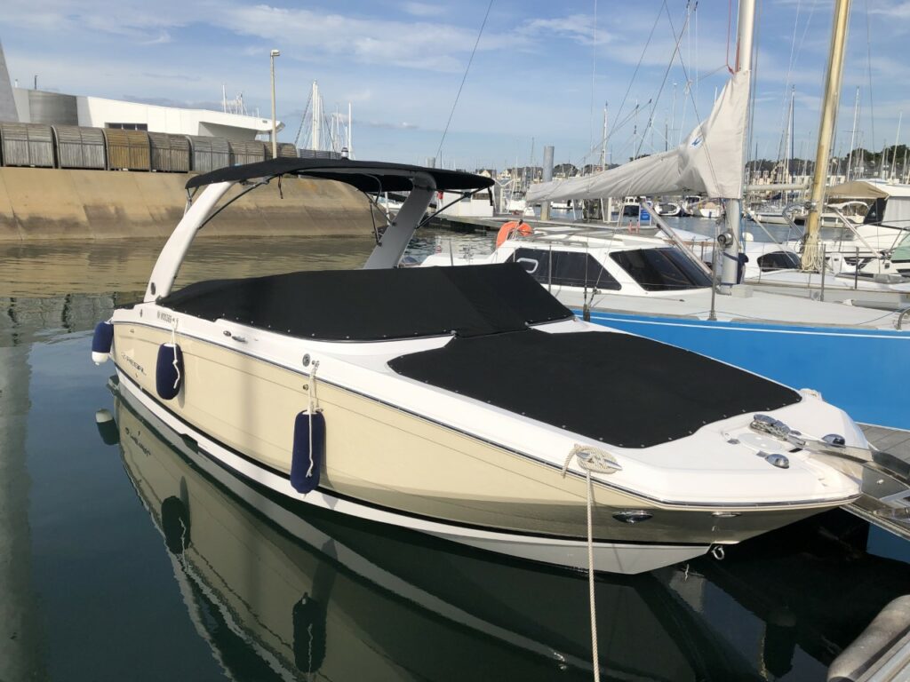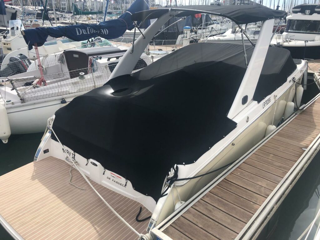 Coque garantie à vie. Carène Fastrack augmentation de la performance & confort de navigation. 30% d’économie de carburant & 26% de vitesse en plus. Longueur 8.10, Largeur 2.50. TE 0.50. Moteur Volvo 300Cv V8. (110 heures) entretien pro’s. Réservoir 280 Lts. Compartiment toilette. Intérieur cuir crème.Vastes zones d’assises. Radio FUSION + six hauts parleurs. Traceur GARMIN. Guindeau électrique. Table de cockpit; Armement de sécurité. Taus Av & Ar plus taud d’hivernage complet.