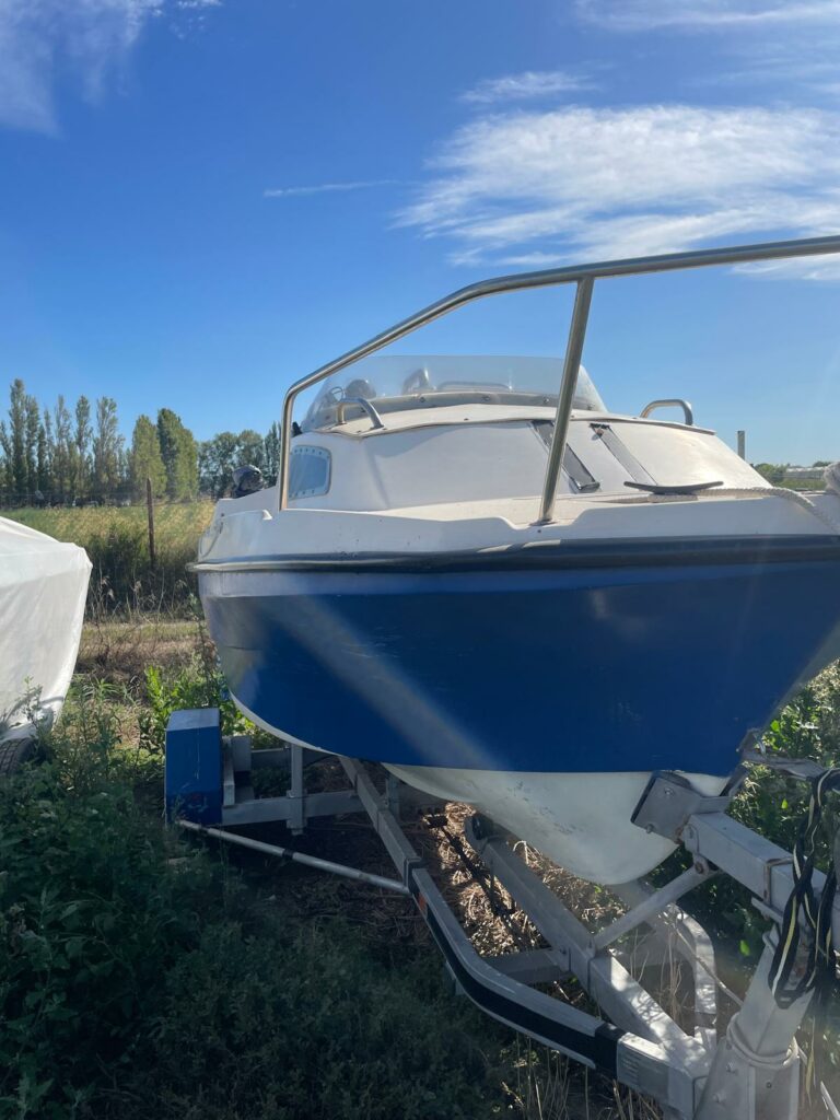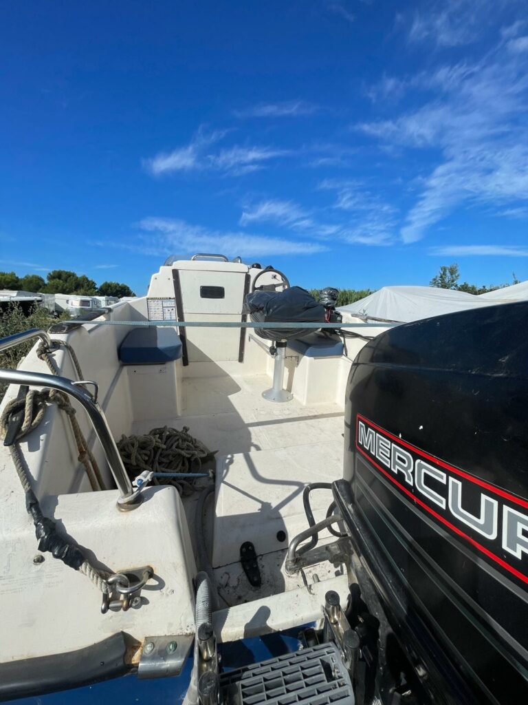 Le bateau est vendu sur remorque Nautilus, avec pneus neufs, ce qui facilite le transport et la mise à l’eau. Il est équipé d’un moteur essence avec batterie moteur neuve.