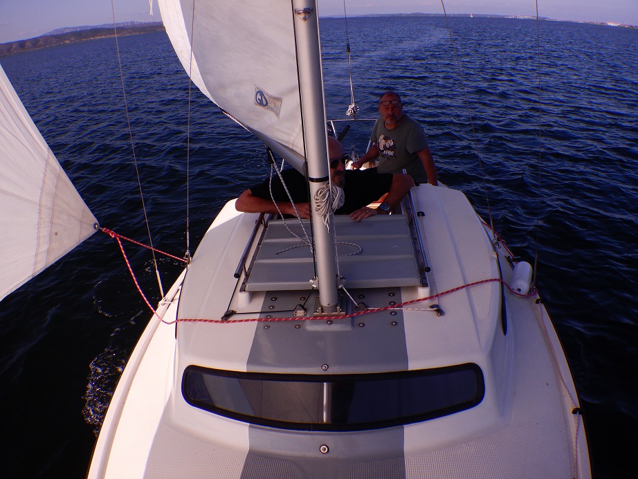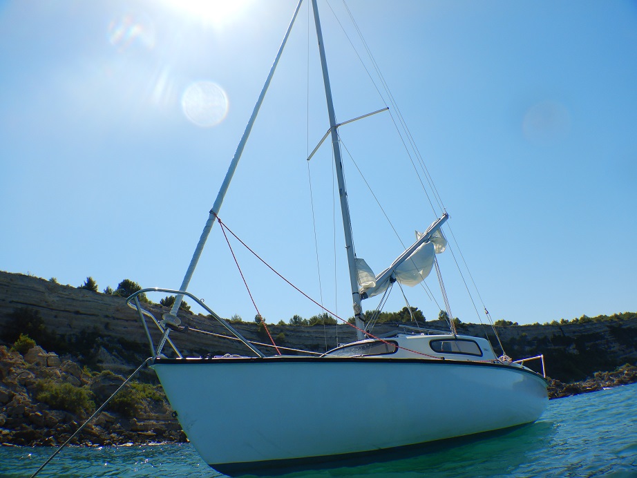 Petit monocoque de 5,60m avec un tirant d’eau de 0,95m. Il est doté d’une dérive relevable qui réduit le tirant d’eau à 0,45m ce qui permet d’accéder au plus près des plages ou de passer sur des hauts fonds facilement.